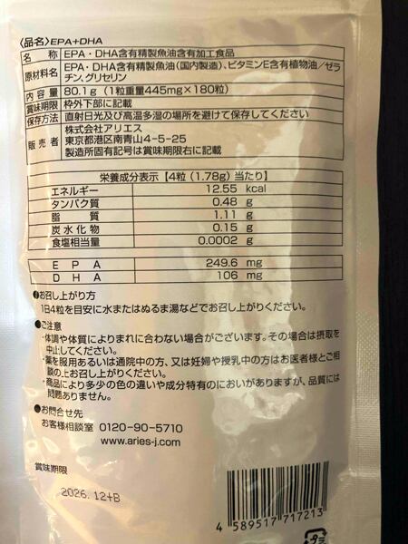 アリエス EPA+DHA 1粒重量445mg×180粒※軽減税率対象(EPA・DHA含有精製魚油含有加工食品)